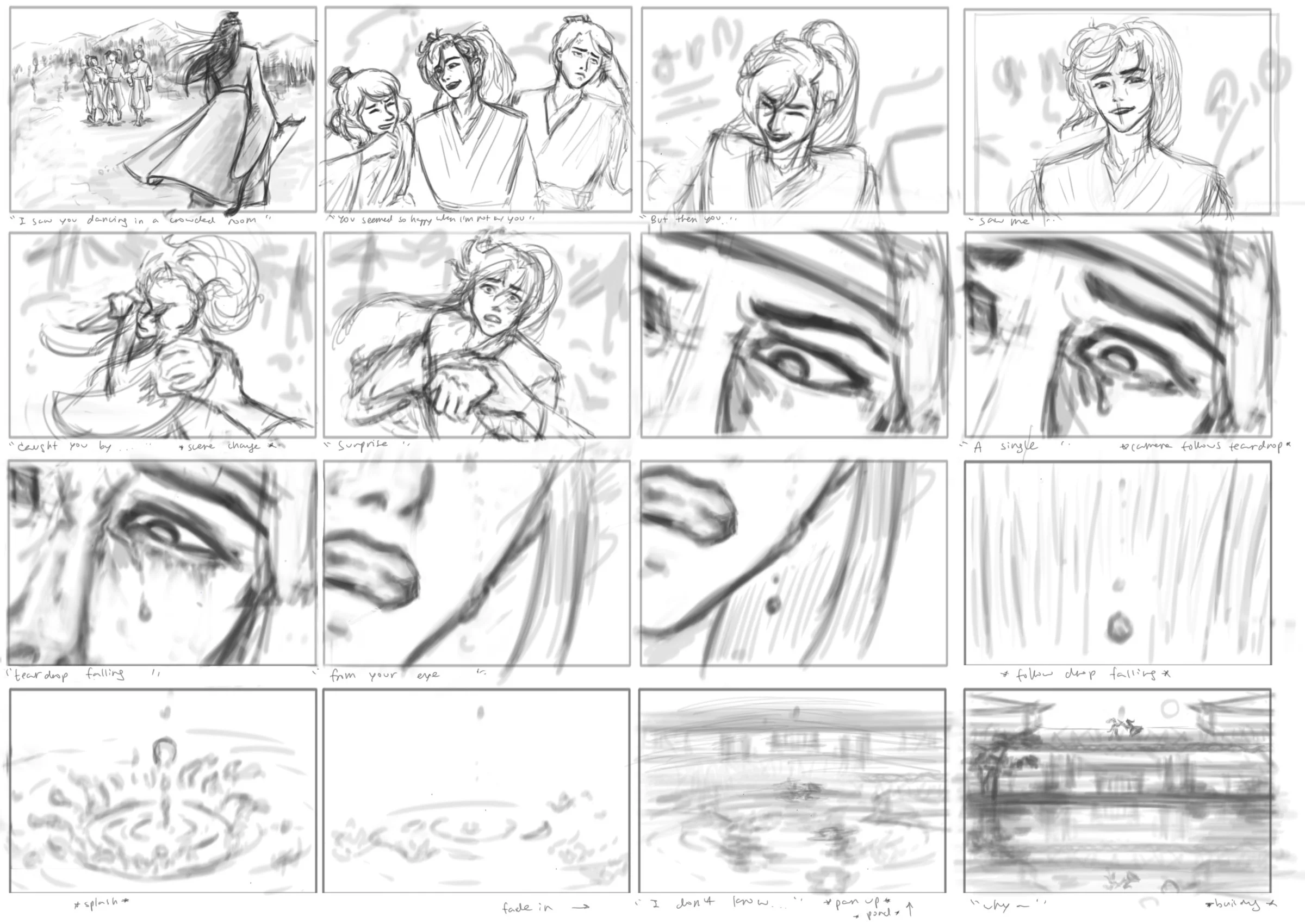 I love the song “Save Your Tears” by the Weeknd and hearing his duet version with Ariana Grande brought an intense level of melancholy and tragic beauty that made me start thinking of this story. I decided to storyboard how I would imagine the visuals of this story (largely based on the anime portrayal of the characters) would into the lyrics and overall tone. My goal is to turn this into an animatic (video version) that switches between each of the panels almost like a rough animation for maybe the first 2 min of the song. Hopefully I’d be able to make that happen over the summer. Wish me luck!