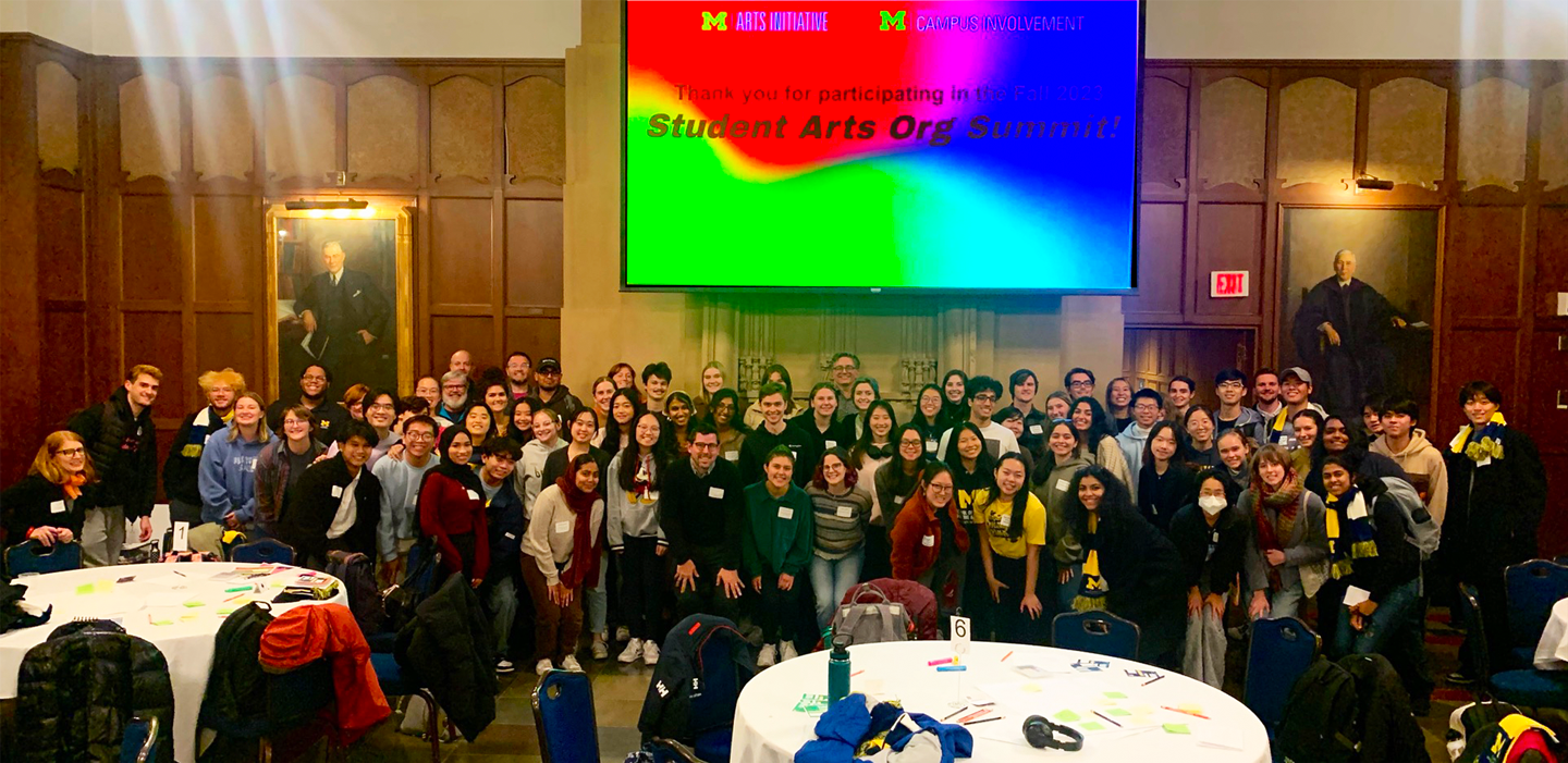 The Arts Initiative and the Center for Campus Involvement host an annual Student Arts Org Summit, a large gathering of student arts org leaders to learn about resources, connect with peers, enjoy some food, and earn money for their organizations. The University has an incredible 250+ student organizations engaging in the arts, whose members come from all degree programs across the University and play a huge role in the Michigan arts ecosphere.